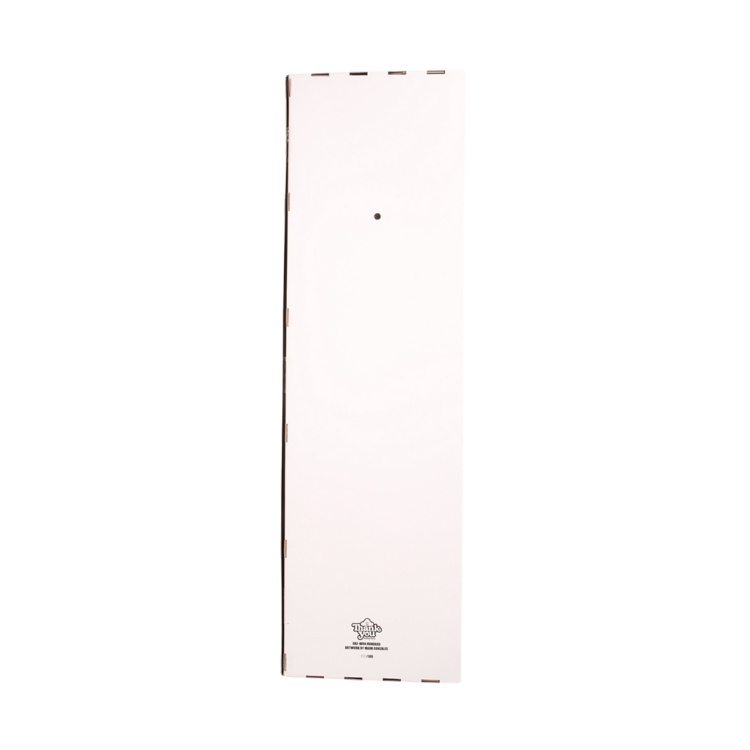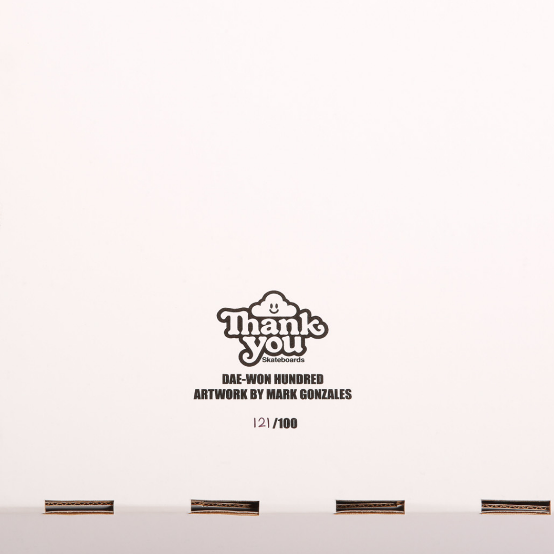 - Product Description: Thank You Skateboards was started in 2018 by Daweon Song and Torey Pudwell as a vehicle to celebrate their love of graphics and to bring attention to reputable causes. In 2022, 100 of these boards were produced. Each deck created had a unique color combination and numbered. Distributed to a small amount of retailers and auctioned off with the help of adidas these quickly sold through to collectors. We have a small amount of these in our archive. Each box set is numbered beyond the original run of 100. We consider these Artist Proofs and were given to Mark to distribute. We do believe these color ways to be unique to the individual board. This particular color way is not listed or featured on the interior of the box listing all 100 of the color ways distributed. - nick